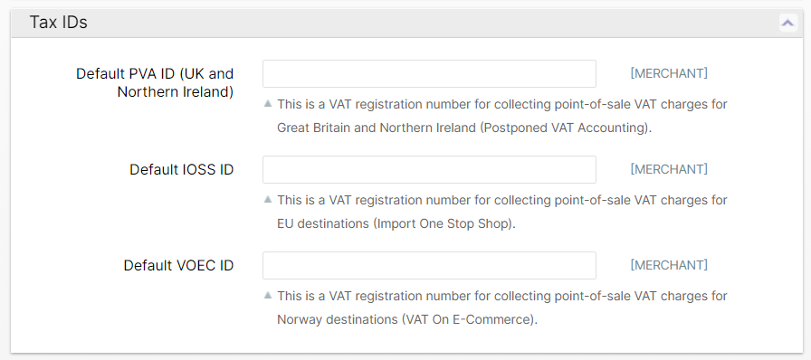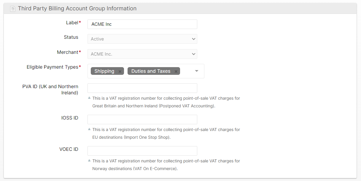 Additionally, you can specify the Tax IDs via a Third Party Billing Group in place of or to override the defaults set in the Shipping Configuration. These will only be used when the order is associated to the TPB Group so be sure to configure that appropriately. The Tax ID fields will only appear when the Eligible Paymetn Types includes the "Duties and Taxes" option.