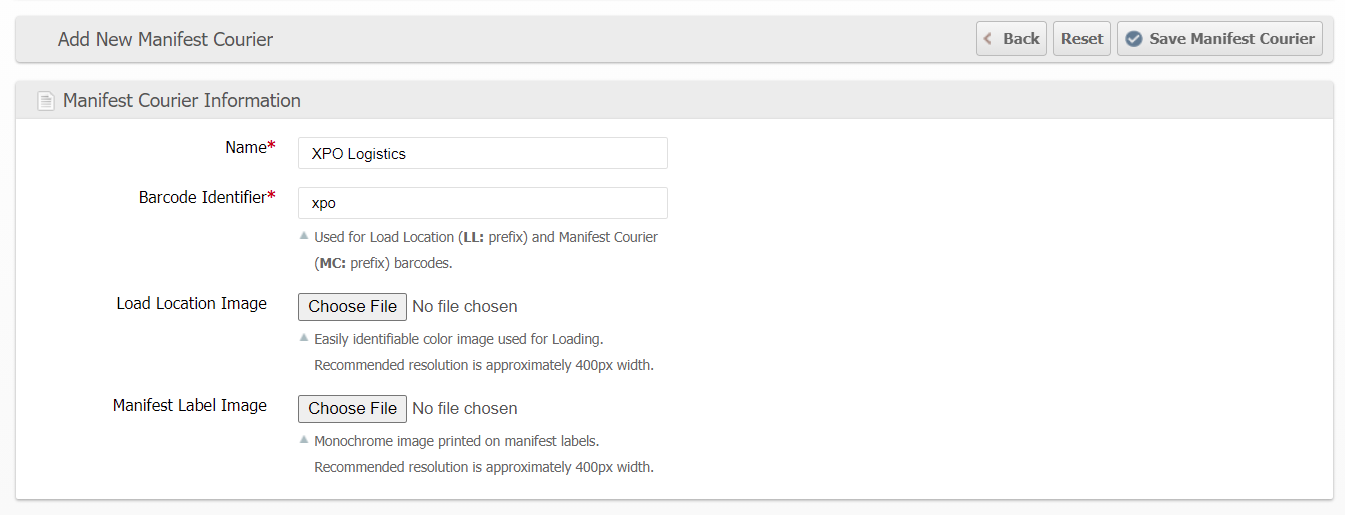 This identifier will be used to associate Load Locations and Manifest Courier barcodes when scanned in the Loading feature. It is recommended to keep this value short so that barcodes can be printed more easily.