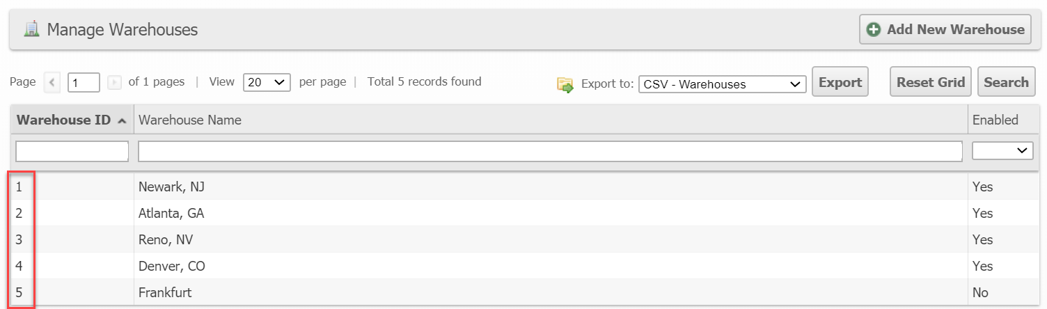 The warehouse IDs can be obtained through the System > Enumerations page, the API using the warehouse.list API method or from the System > Warehouses page.