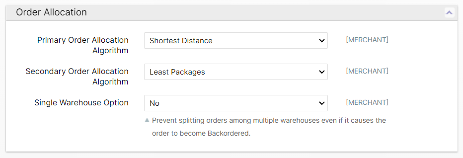 - Preferred - Orders will be allocated to a single warehouse unless there is none that are eligible and have all items in stock. Otherwise, splitting will be allowed as a last-resort.