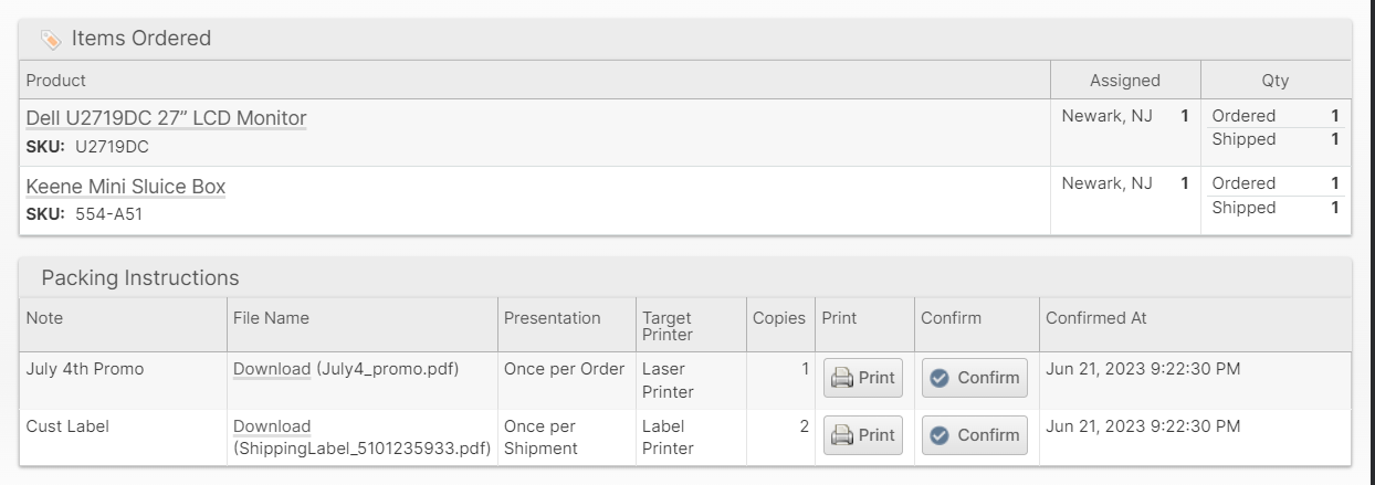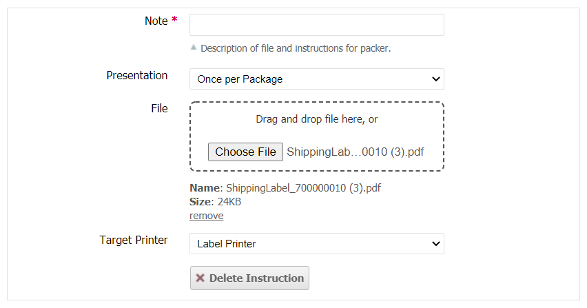 If a File is added, the "Target Printer" specified will determine which printer type the print job will be sent to. The "Presentation" will also determine how many copies of the file to send to the printer depending on how many shipments or packages are used to complete the order.