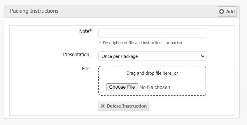 Packing Instructions can be added via the Admin or Client UI during order creation or after, as well as through the API.