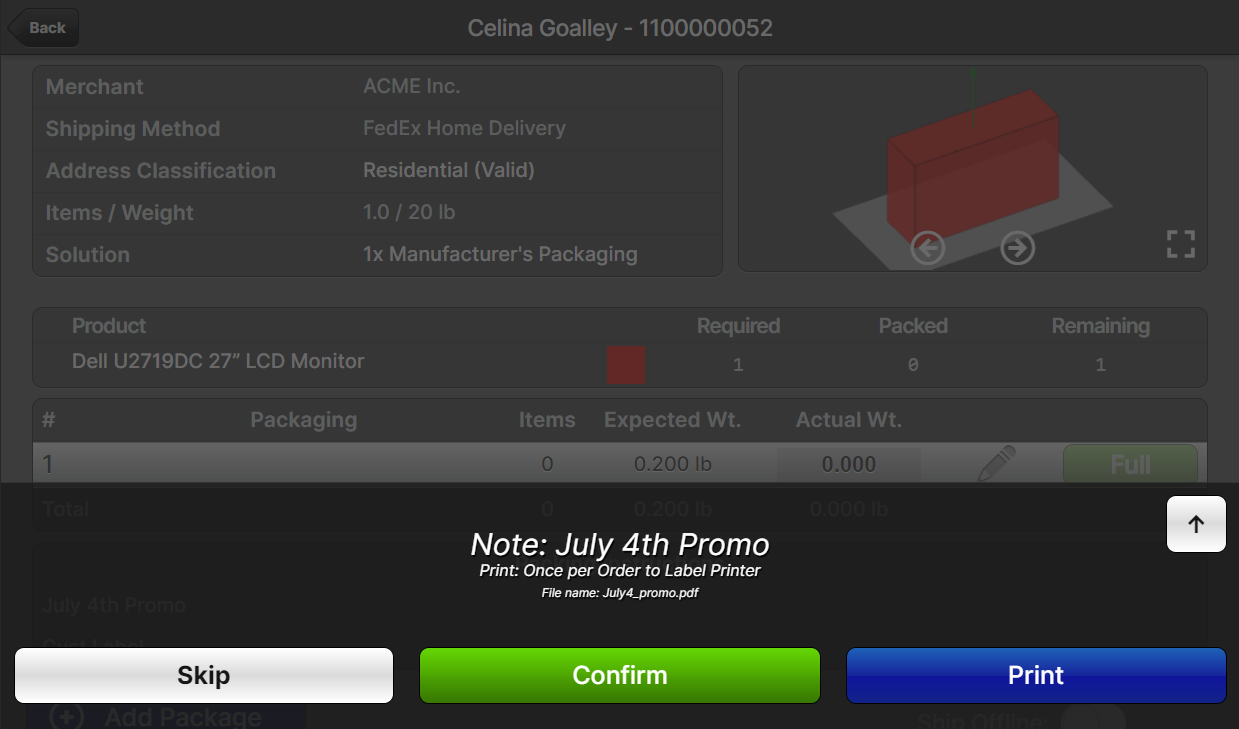 The Packing Instruction Note will be presented to the packer in the Scanner UI the appropriate number of times based on the Presentation option. If a file was attached, the user may tap Print to immediately print the document to the selected printer based on the Target Printer type.