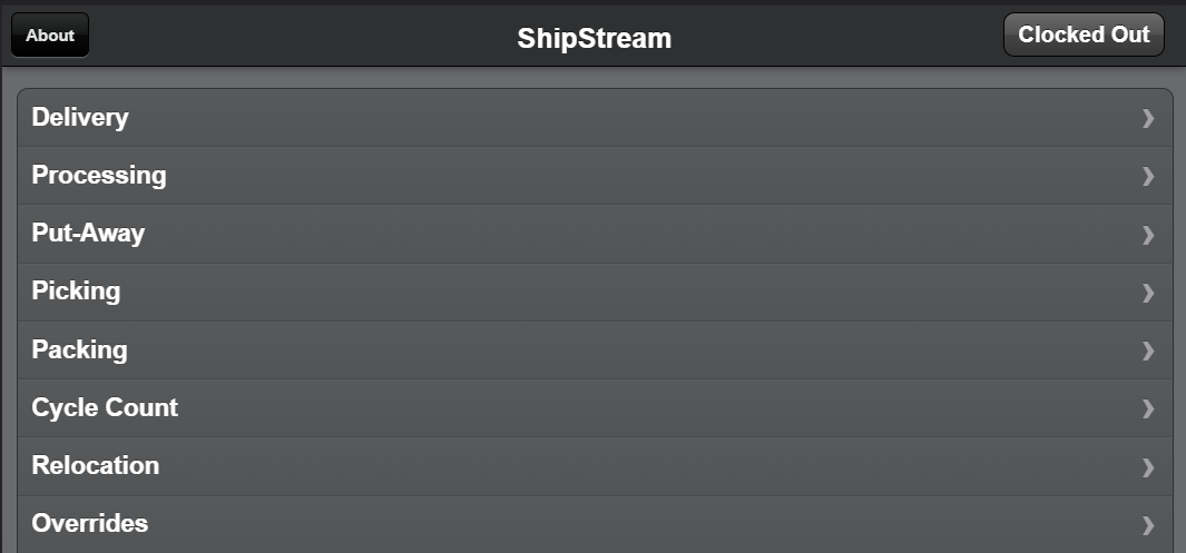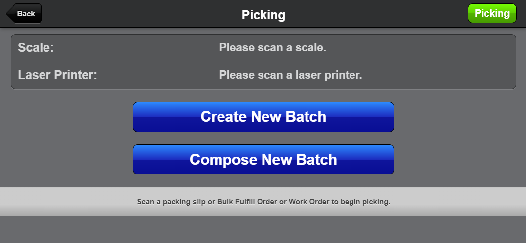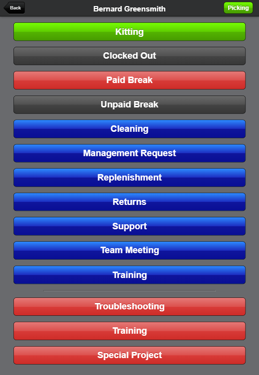 If you have Time Management enabled your current status will be displayed in the upper-righthand corner of the screen. The status will be managed automatically when performing tasks in the Scanner UI. For example when you tap Picking, your status will begin to be tracked as "Picking".