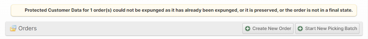 Similarly, you can instantly expunge PCD for completed orders manually by using the Expunge PCD mass action. This is not reversible, but you will be prevented from expunging data for incomplete orders with a warning: