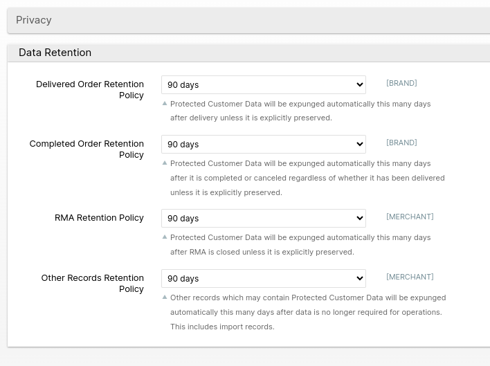 You may override the retention policy for individual Merchants and Brands, so if you have specific partners that require stricter policies than others you may easily configure different policies for them.