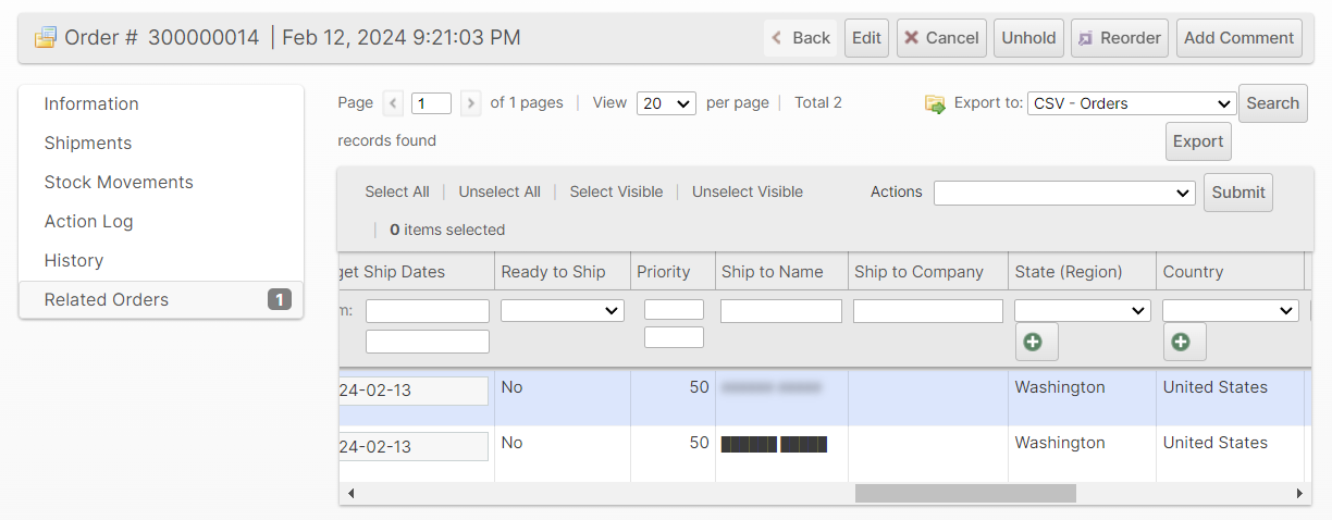 Orders with expunged data will still be associated in the "Related Orders" tab of the order page with other orders that have or had the same email address or street address before being expunged.